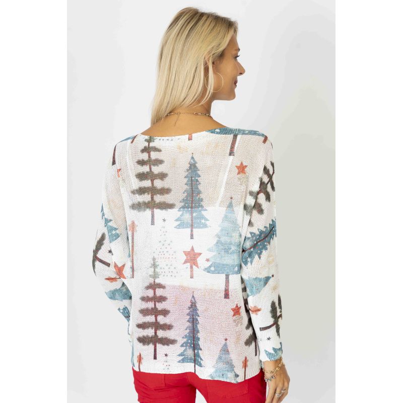 This is our ONESIZE fits most white Christmas Tree Sweater. Scooped waistline with glitter thread to make it sparkle.