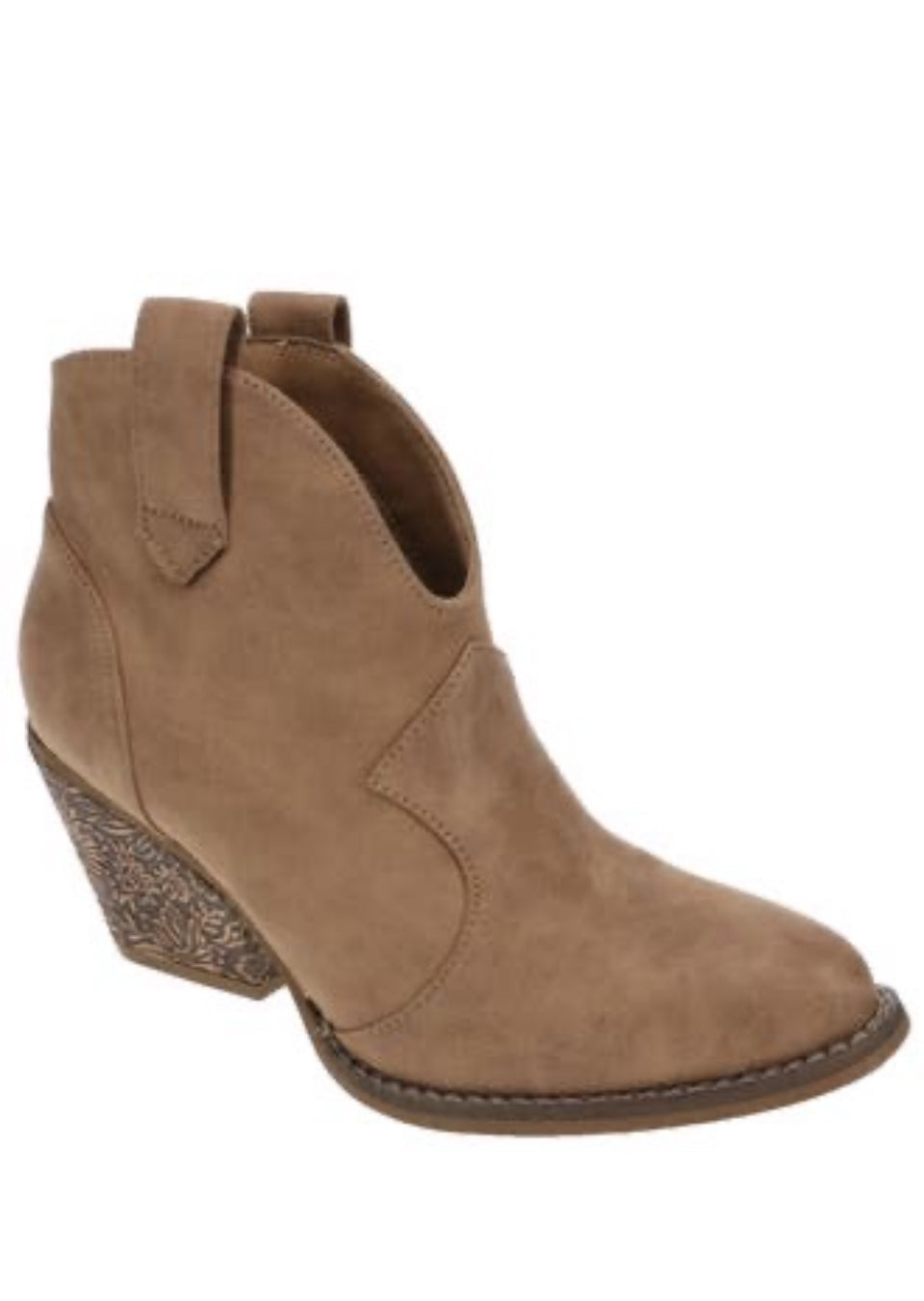 This is our Very G Dangerous 2 embossed western ankle bootie in light tan faux leather. It has a 2 inch heel with Paisley stamping.