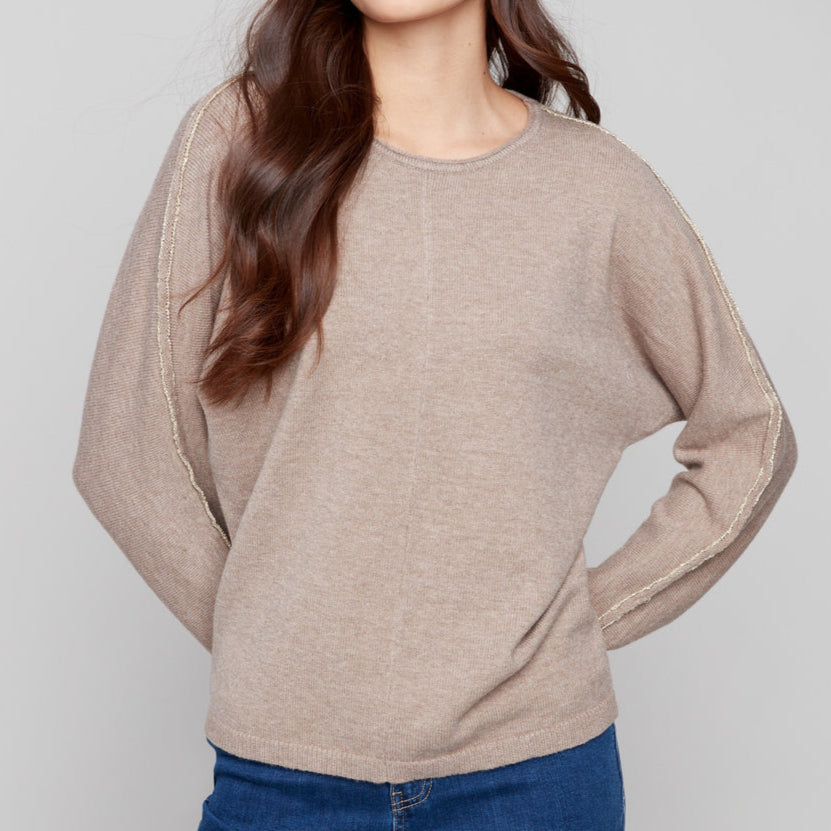 Long sleeve taupe sweater with gold trim down the front of the sleeves.  Viscose, polyester, and nylon.  Hand wash.