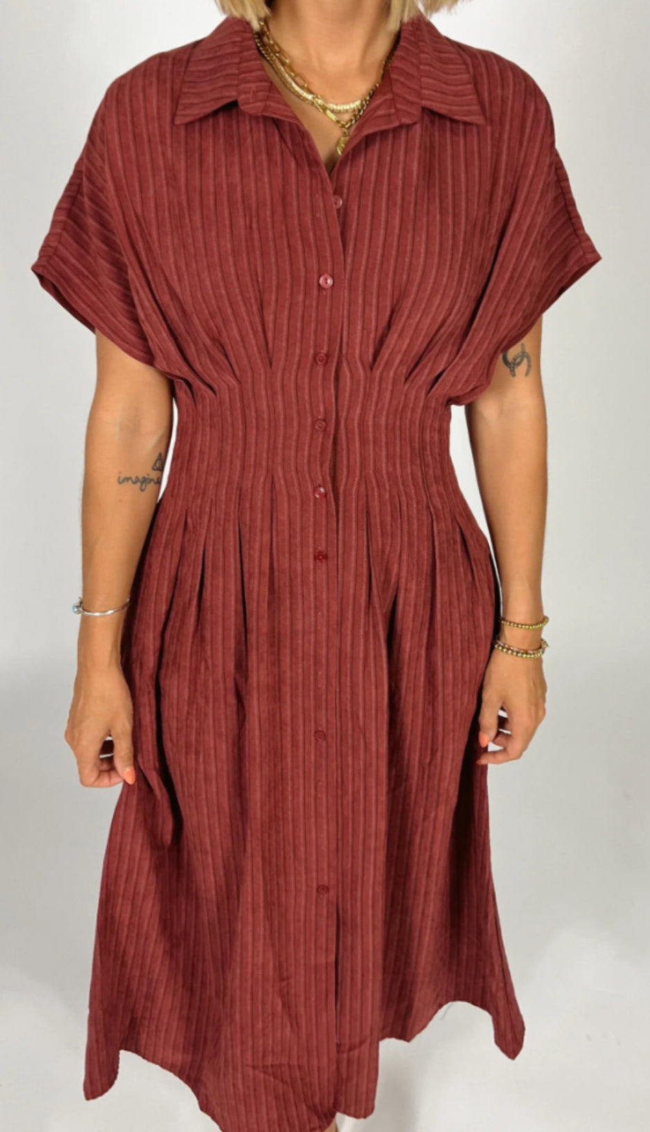 Long button down burgundy suede dress. Lined. Polyester and nylon blend. Hand wash.