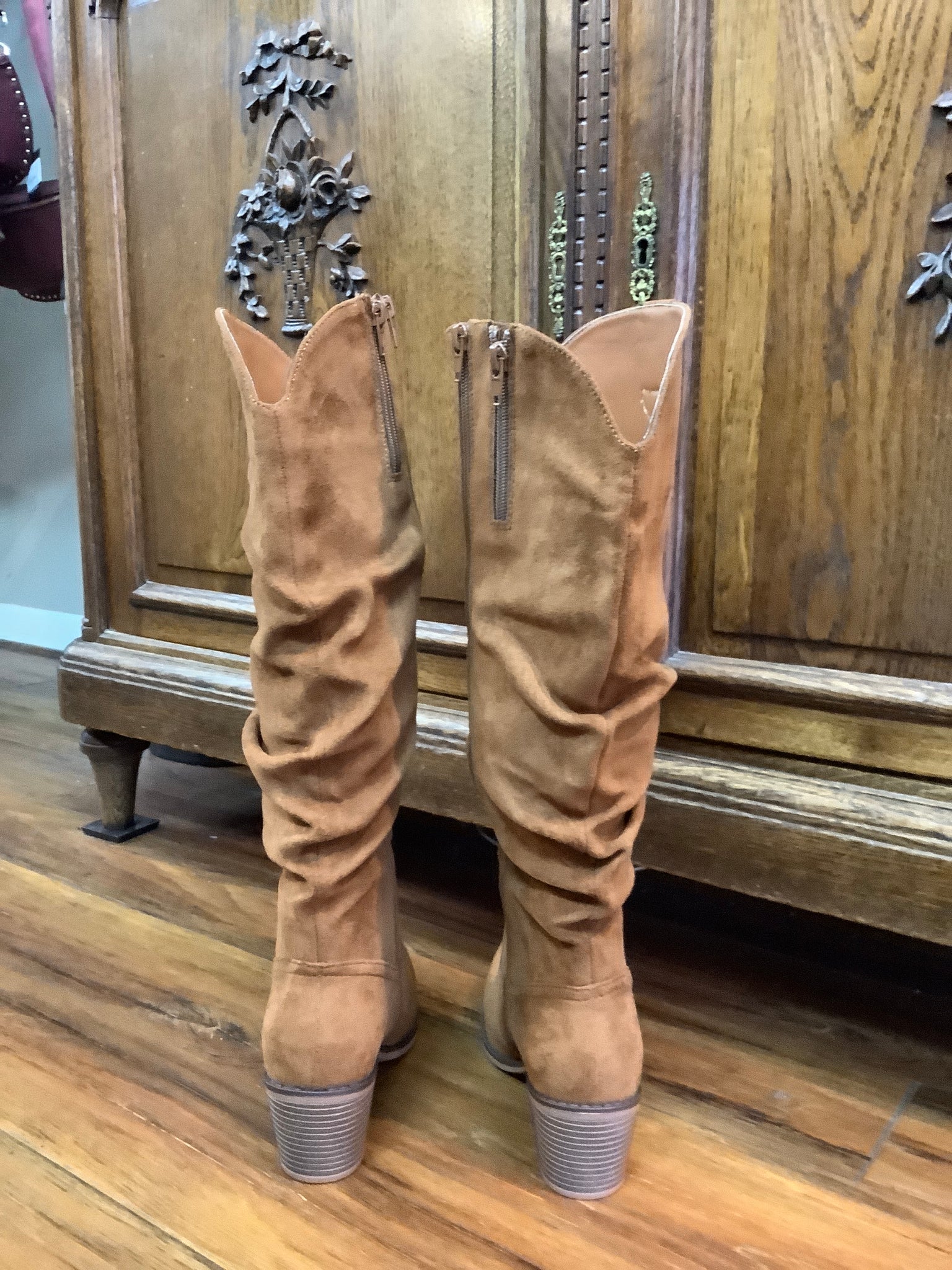 Tall, faux suede boots with 2" heel. Include zipper up the side with extra zipper for bigger calves.