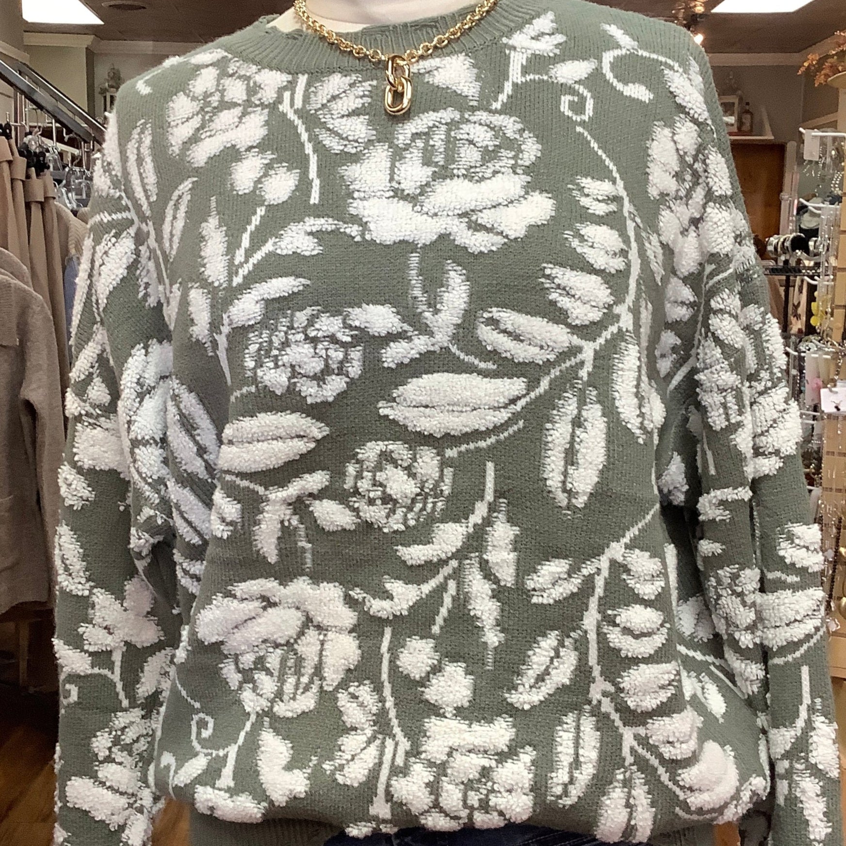 Olive green sweater with white floral design and worn scalloped edges. 50% viscose, 25% polyester, and 25% nylon. Hand wash cold, lay flat to dry.