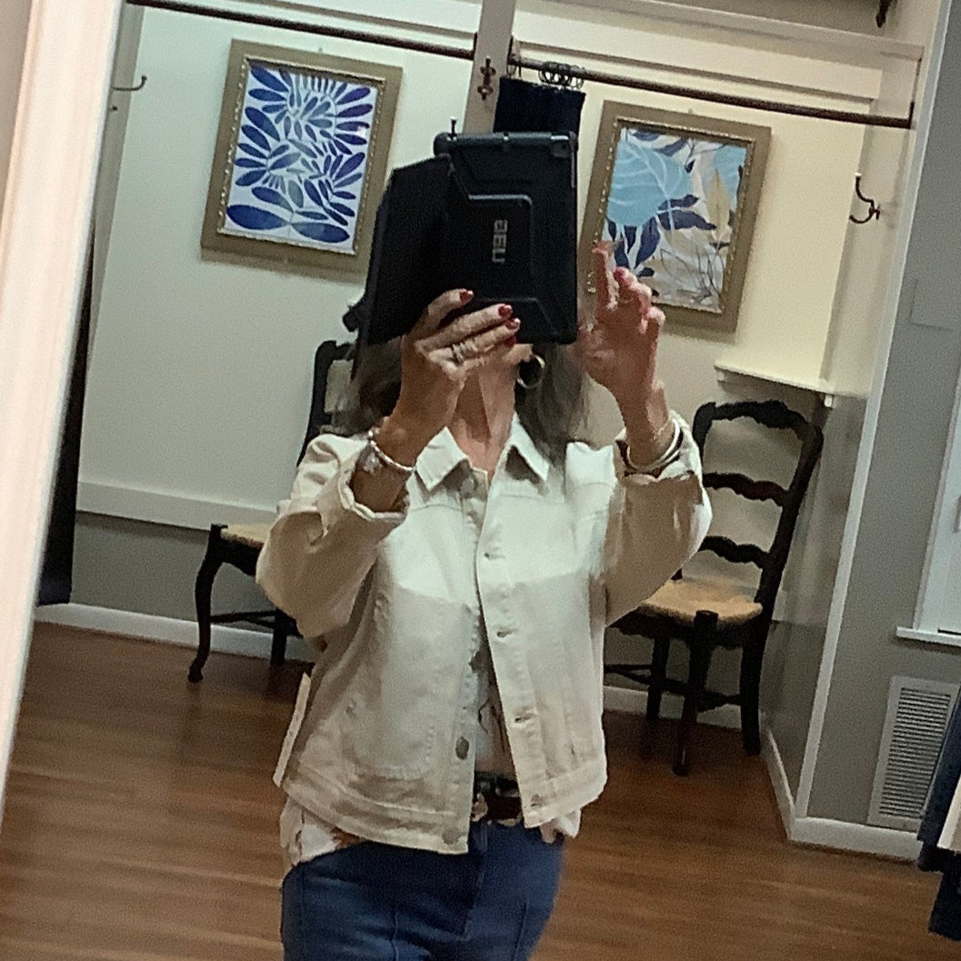 Long sleeve sandstone jacket with pockets. 5-button. Cotton, polyester, spandex. Machine wash.